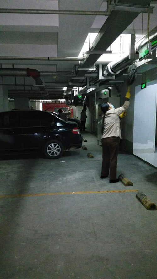 華納大廈項(xiàng)目管理處清理地下車場(chǎng)管線灰塵工作現(xiàn)場(chǎng)